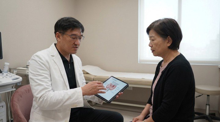 醫師在診間詳細解說影響甲亢停藥的四大因素 診所提供專業環境進行甲亢停藥前的指標諮詢 透過抽血數據與超音波精密判斷甲亢停藥時機 甲亢患者與醫師討論治療計畫的診間場景